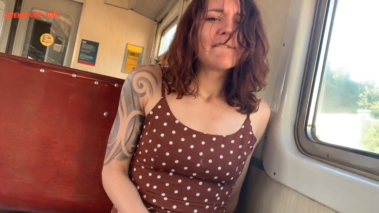 Ласкает свою пухлую писечку в электричке и сводит ножки от кайфа
